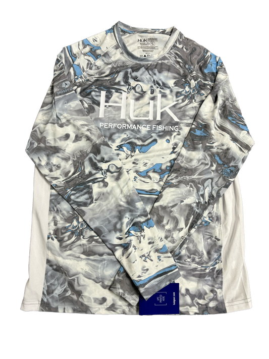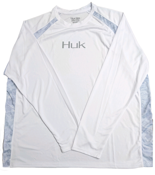 Huk Performance Fishing Camo manga larga blanco con azul helado #144273 camisa de sol para hombre