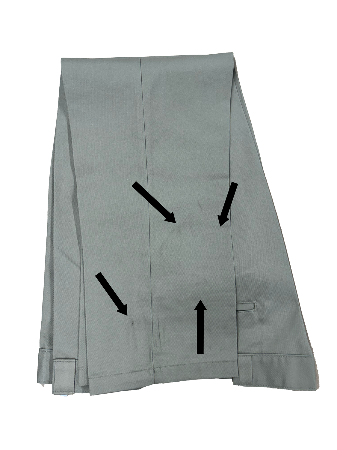 These pants are brand new, but are soiled on the leg, highlighted by the black arrow(s). Therefore, these will be sold "as-is."