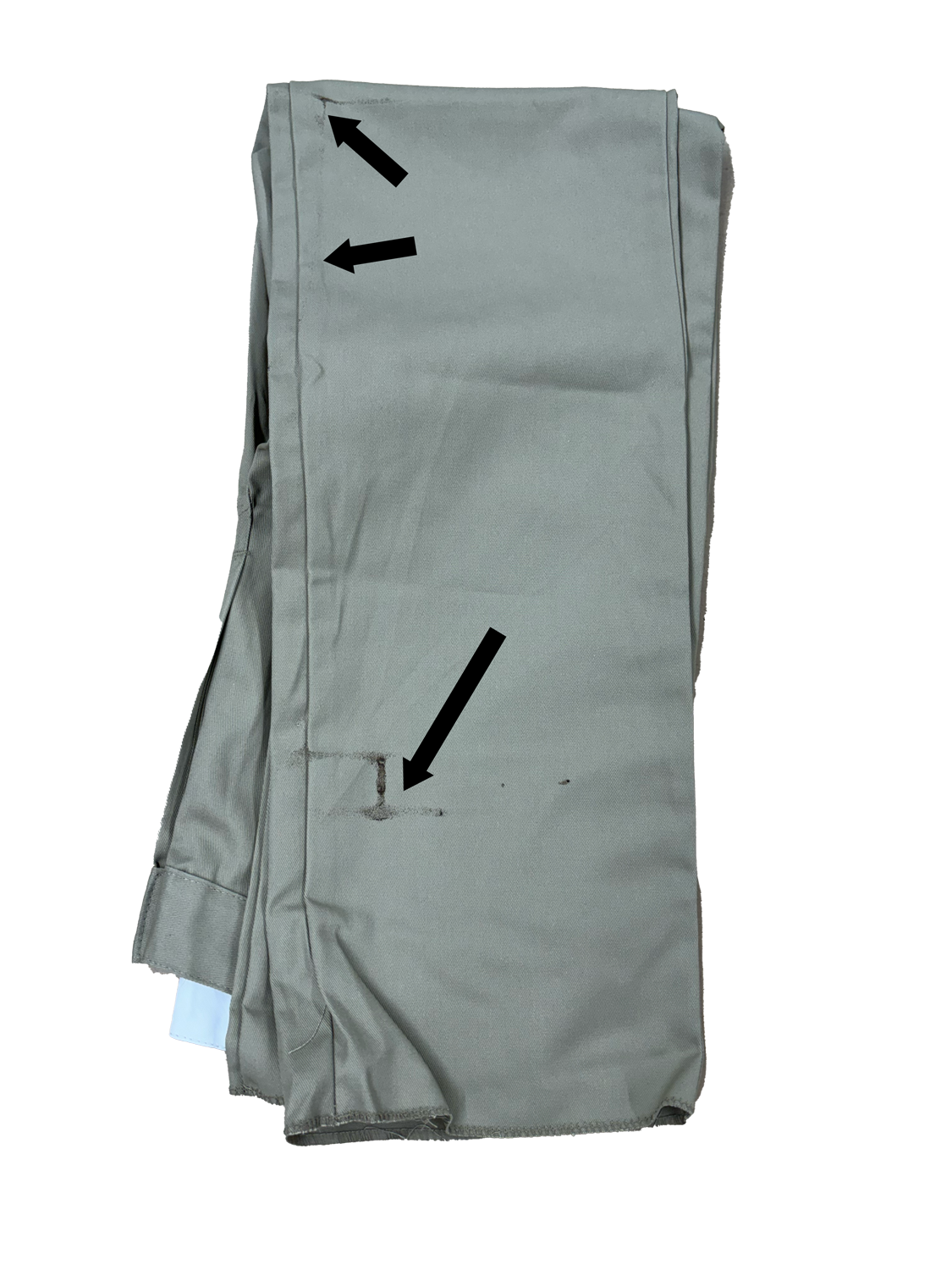 These pants are brand new, but have a minor thread defect, highlighted by the black arrow(s). Therefore, these will be sold "as-is."